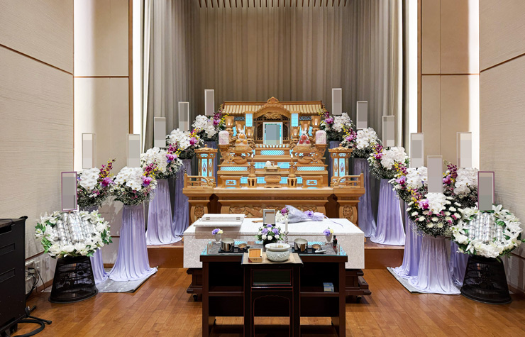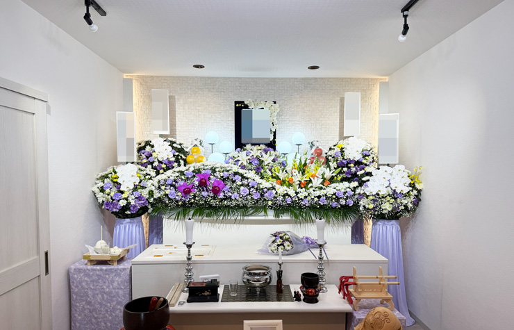 1日1組貸切15名以内。当社家族葬ホール心温(しおん)で行う家族葬プランです。こじんまりと家族だけで送りたい方、お花の祭壇で送りたい方、宗教者などの縛りがなくお別れ会などの自由なスタイルで送りたい方などに最適なプランです。