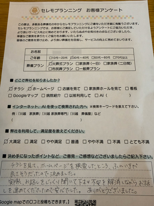 初めてのことでご不安も多かったかと存じますが、「安心できた」というお言葉をいただけて、私共もホッと胸をなでおろしております。お話をじっくりとお伺いする時間は、私たちにとってもご家族様の想いに触れられる大切なひとときでした。